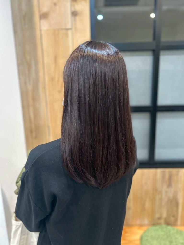 ツヤ感を重視したナチュラルストレートのミディアムロングスタイル。重さを残したワンレングスベースで毛先に自然な丸みをつけることで、まとまりと上品さを両立しています。赤みを抑えたダークブラウンカラーが光を柔らかく反射し、美髪感を引き立てる仕上がり。オフィスでも好印象な清潔感のある王道ストレートヘアです。